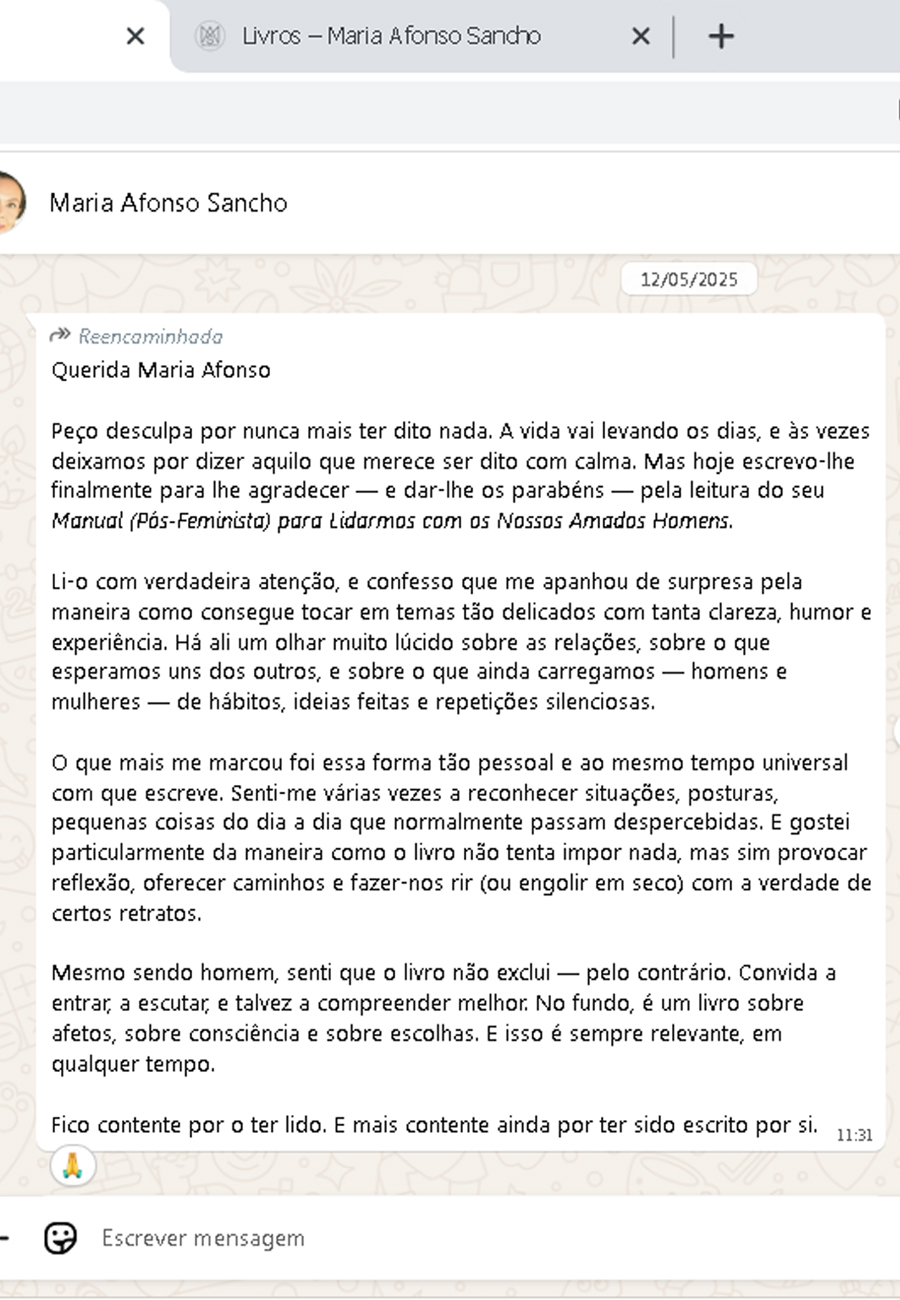 É um livro simples que, numa linguagem coloquial e feminina, nos conta como são os nossos amados homens.